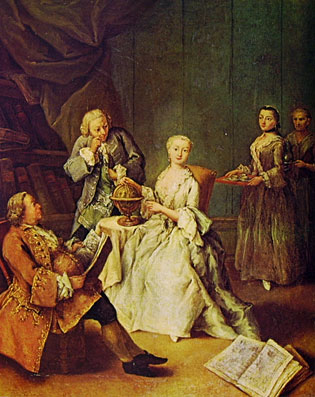 Pietro Longhi, La lezione di geografia (1752), Pinacoteca Querini Stampalia, Venezia. In uno studio ricolmo di libri e di atlanti due gentiluomini puntano il loro sguardo su una dama che esibisce la sua competenza geografica, indicando un mappamondo e avvicinandovi un compasso. Due cameriere emergono dall’ombra portando rinfreschi. Difficile capire chi stia tenendo la lezione e chi, invece, la stia seguendo. Sulla giovane donna al centro risplende tuttavia una luce chiarissima a suggerire, forse, che la dama è letteralmente "illuminata" dalla conoscenza.